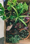 I was growing a bunch of little plants under a grow-light display at work, but we had to move the display so I got to take them all home :3 each plant in the box has a story and all of them were grown from clippings or saved from the compost