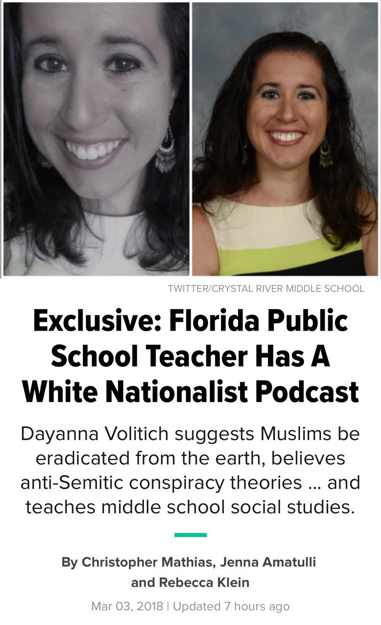 Dayanna Volitich, a 25-year-old social studies teacher at Crystal River Middle School in Florida, has been secretly hosting the white nationalist podcast “Unapologetic” under the pseudonym “Tiana Dalichov” and bragging about teaching her views in a public school, HuffPost has discovered.