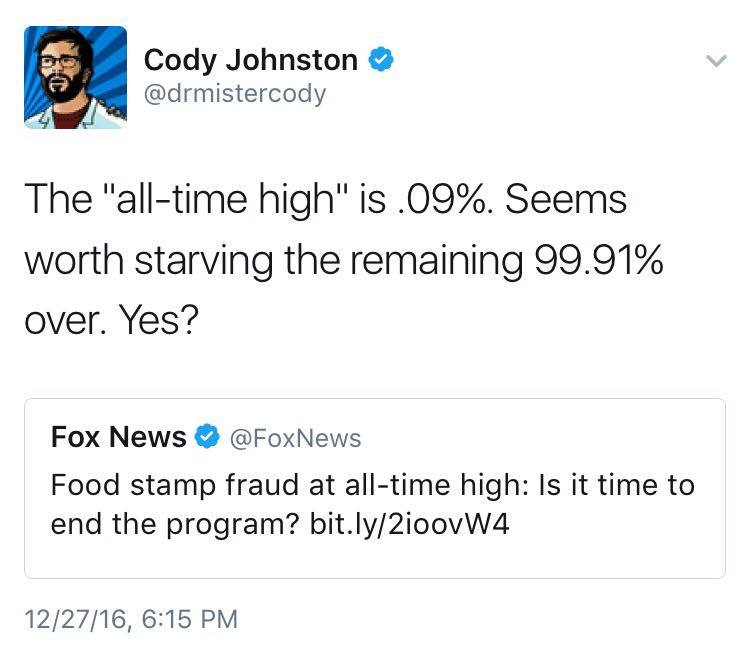 TBH even if one hundred percent of people on food stamps were committing food stamp fraud I’d still be in favor of keeping the program around