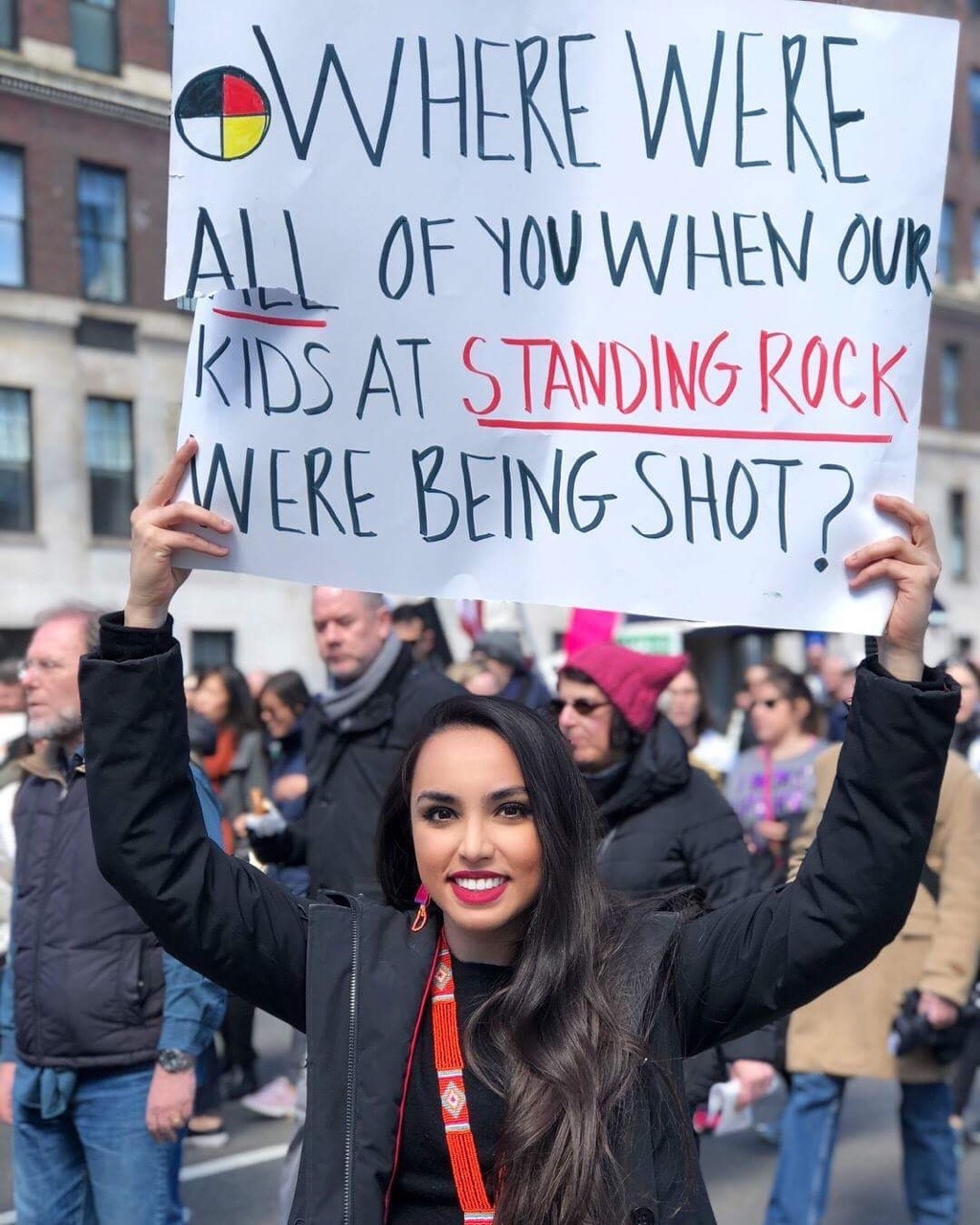 A person with pink lipstick and long black hair looking at the camera. They are holding a sign that says “WHERE WERE ALL OF YOU WHEN OUR KIDS AT STANDING ROCK WERE BEING SHOT?” Before the text is a circle divided into quarters, with one black quarter, one red quarter, one white quarter, and one yellow quarter. There are many people walking behind the person holding the sign.