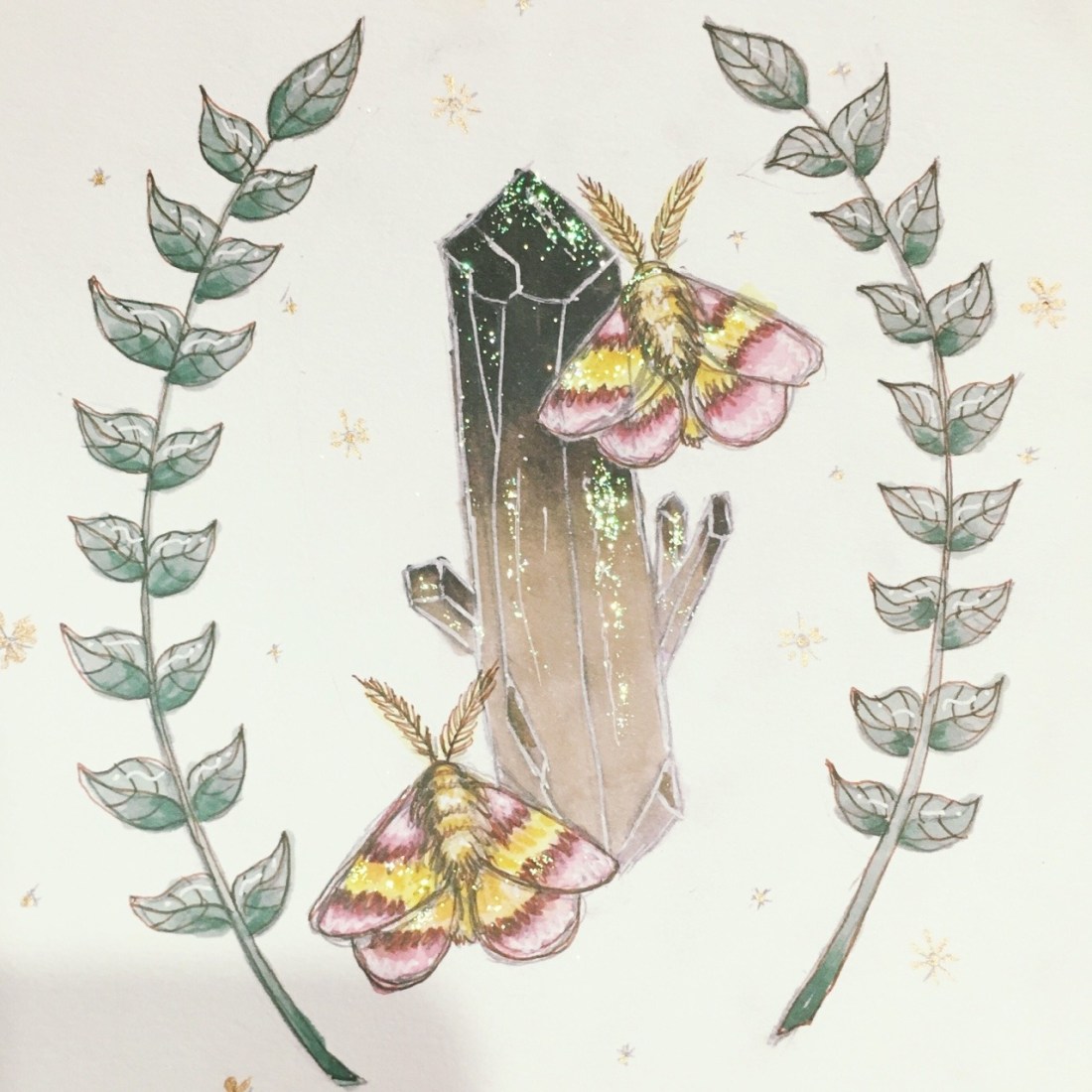 Rosy maple moths, plants, and smoky quartz piece I made tonight~ 🌙✨🌿