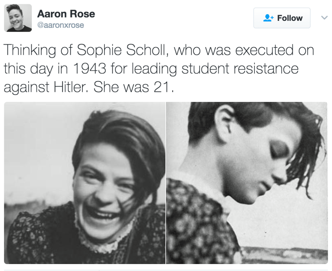 Of course, the terrible things I heard from the Nuremberg Trials, about the six million Jews and the people from other races who were killed, were facts that shocked me deeply. But I wasn’t able to see the connection with my own past. I was satisfied that I wasn’t personally to blame and that I hadn’t known about those things. I wasn’t aware of the extent. But one day I went past the memorial plaque which had been put up for Sophie Scholl in Franz Josef Strasse, and I saw that she was born the same year as me, and she was executed the same year I started working for Hitler. And at that moment I actually sensed that it was no excuse to be young, and that it would have been possible to find things out.