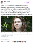 Specifically, this study can now be used in medical offices and courtrooms. A trans kid’s parent can take this study to their bigoted local doctor and say “see, this is why you should either treat my kid or give us a referral to a doctor who will.” Or this can be taken into various legal proceedings about name changes, birth certificate changes/corrections, and custody hearings where it becomes necessary to prove to a judge that yes, helping the kid transition (and perhaps leaving the kid with the parent/guardian who is willing to help) is what is best for the kid.