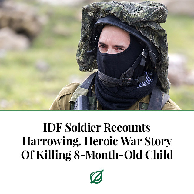 JERUSALEM—Describing the terrifying yet valiant experience to his fellow battalion members, Israel Defense Forces soldier Yossi Saadon recounted Tuesday his harrowing, heroic war story of killing an 8-month-old Palestinian child during a violent attack against protesters. “It was a heart-pounding experience—there was smoke and gunfire all around me, and I made a split-second decision to hurl that canister of tear gas at the encroaching infant cradled in her father’s arms,” said Saadon to the group of awed soldiers, describing the chills that went up and down his spine as he realized that all he had was his M16 assault rifle and some tear gas to defend himself against the unarmed Palestinian family standing only dozens of yards away. “I could see the whites of the baby’s eyes and hear her terrifying cries, and I knew it was either her or me. And this wasn’t some newborn infant, you know? This was a baby who could probably sit up independently. I was scared, but I acted quickly to throw that tear gas at her and her older sister. And who knows how many lives I saved when I shot the women trying to help her?” At press time, Saadon’s battalion commander informed him that he was submitting his name for the Medal of Valor, the IDF’s highest honor.